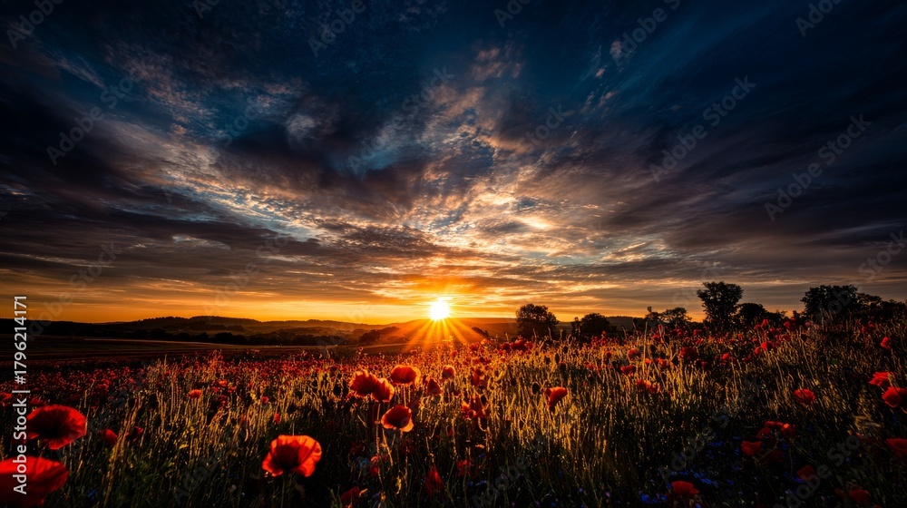 • A stunning sunset over a red poppy field in the English countryside, casting long shadows and creating a vibrant, enchanting atmosphere that captures nature’s beauty at its most captivating moment.