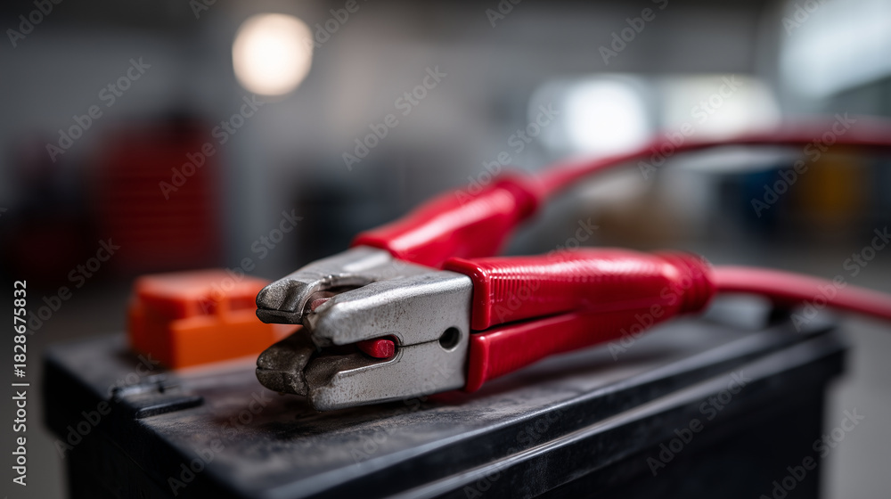 Plakat do Sypialni - A high-resolution close-up photo of a car battery with jumper cables attached to the terminals.... #1828675832