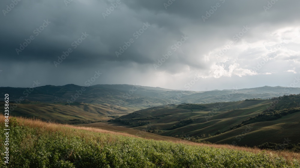 Plakat do Sypialni - Landscape photograph of a vast open field with rolling hills and valleys. the sky is filled with... #1842358620