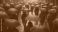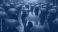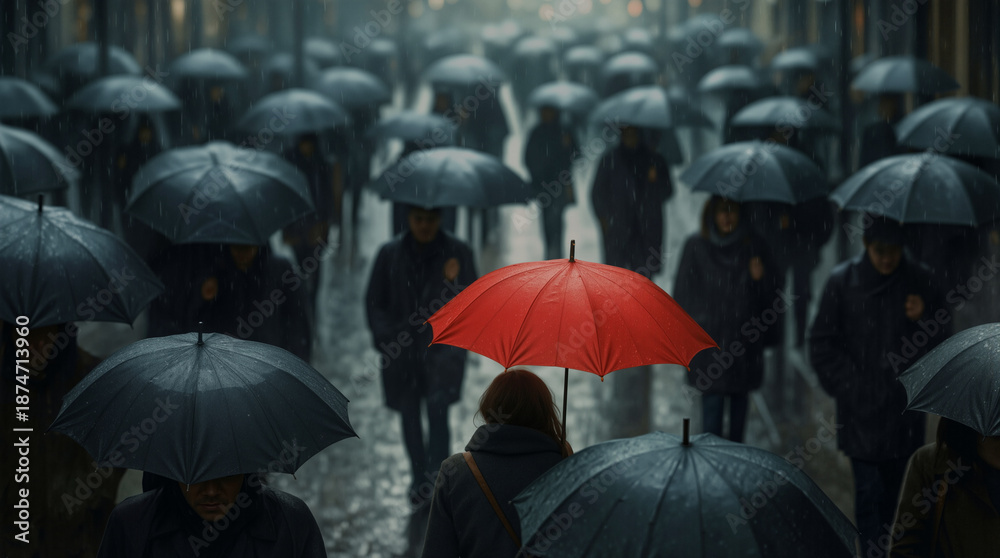 • Many people stroll through a city street during a rainy day. Most of the crowd carries dark umbrellas while one person stands out with a red umbrella. The wet pavement reflects the muted colors around