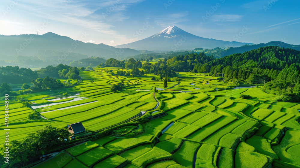 Plakat do Sypialni - green rice field with traditional Japanese local village of Japan at Mount Fuji, one of the most... #1913404890