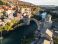 • Aerial view of Stari Most (Old Bridge) and Neretva river in Mostar at sunset, Bosnia and Herzegovina. Iconic UNESCO world heritage site and ottoman architecture panorama.