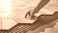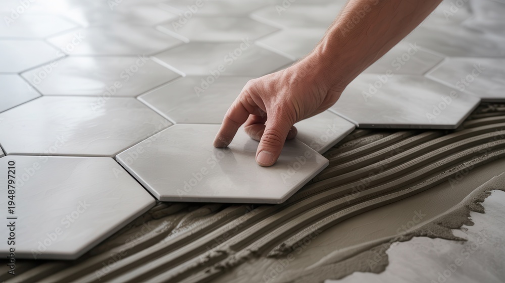 Plakat do Sypialni - Hand placing hexagonal tiles on wet cement floor #1948797210