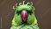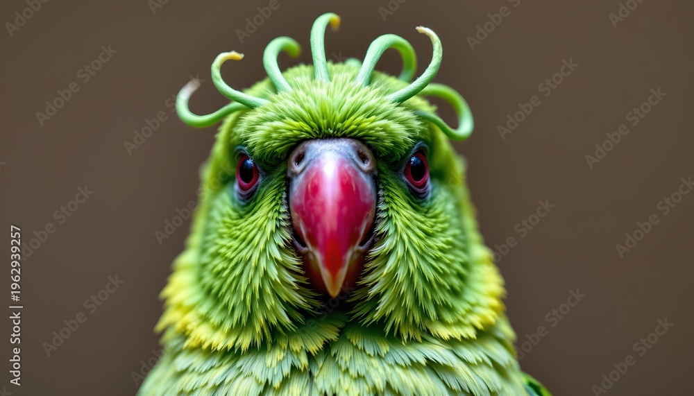 • The image features a close up of a bird with vibrant green feathers covering most of its face and body