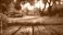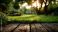 • Drewniany taras z widokiem na skąpany w słońcu ogród. Soczysta zieleń trawy i rozmyte drzewa w tle tworzą ciepłą, relaksującą atmosferę.