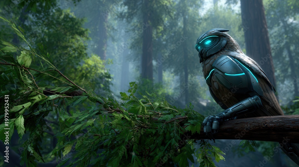 Plakat do Sypialni - Cyborg owl perched on tree branch in misty forest with glowing blue eyes #1979952431