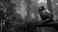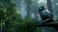 • Cyborg owl perched on tree branch in misty forest with glowing blue eyes
