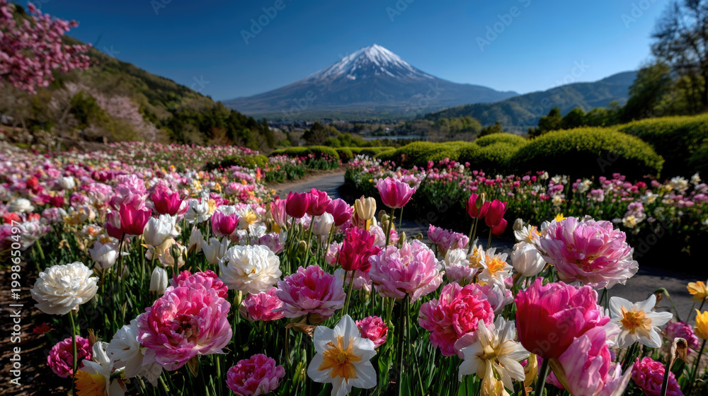 • One of the most visit destination in Japan, beautiful view of Mount Fuji or Fujiyama with colorful blooming flower garden.