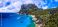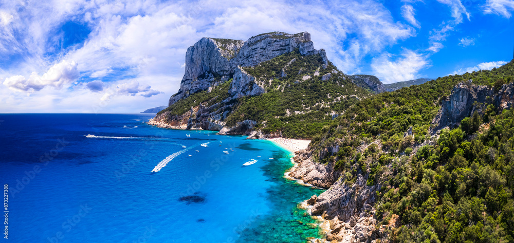 • Best and most beautiful beaches of Sardegna island (Italy) - impressive Cala Sisine in gulf of Orosei . Aerial panoramic drone view of white sandy beach and turquoise sea