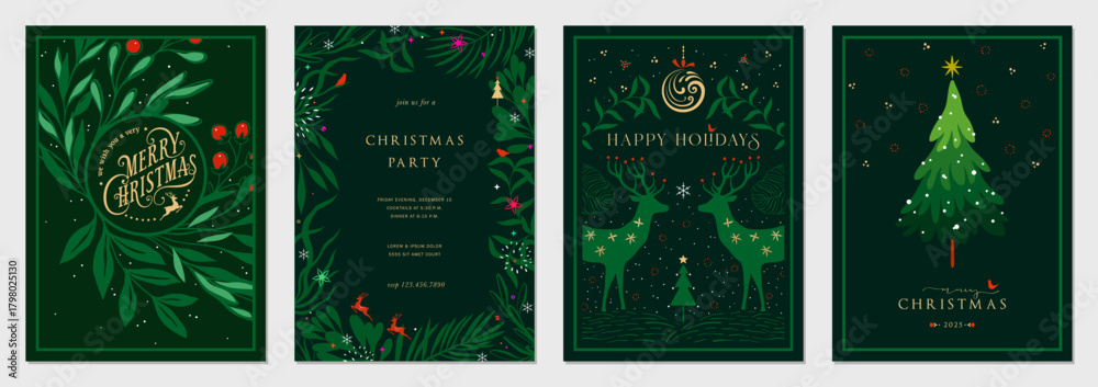 • Corporate Holiday cards with Christmas tree, reindeers, birds, ornate floral frames, background and copy space. Universal artistic templates.