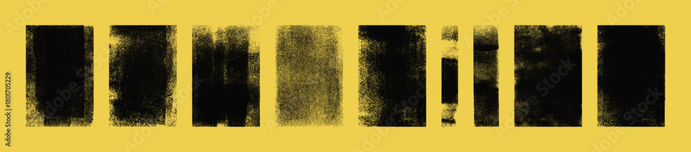 • Set of grunge rolled ink stamp textures handmade with brayer. Letterpress vintage rough rectangle vertical backgrounds. Linocut relief printing shapes vector illustration isolated on yellow background