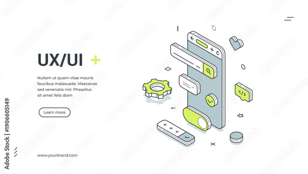 • UX UI design web banner. Isometric template for a landing page on user experience. Vector illustration with a smartphone and interface elements for app development and prototyping