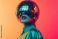 • Stylish woman in a disco ball helmet against a vibrant gradient background, combining retro and futuristic fashion aesthetics.