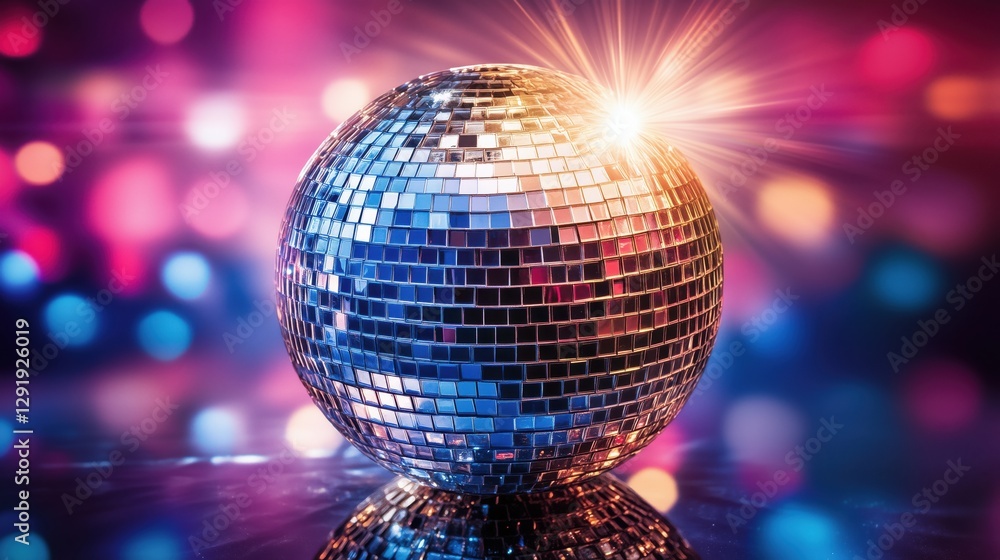 • Mirror ball poster featuring a sparkling disco ball reflecting colorful lights at a lively party atmosphere
