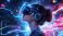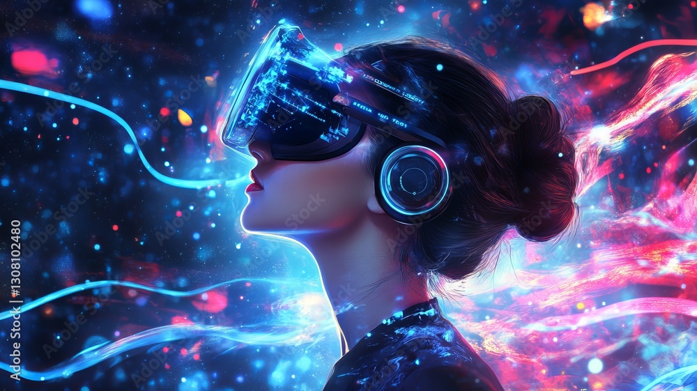 • stylish young woman in VR headset, surrounded by digital particles and futuristic design