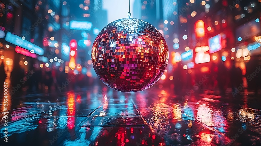 • Dazzling Disco Ball Suspended Over Cheering Crowd in Vibrant Urban New Year s Eve