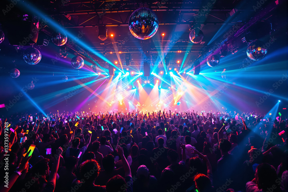 • Large crowd dancing and enjoying a live concert with colorful lights and disco balls in a vibrant indoor scene, festive music hobby background. Ai generative