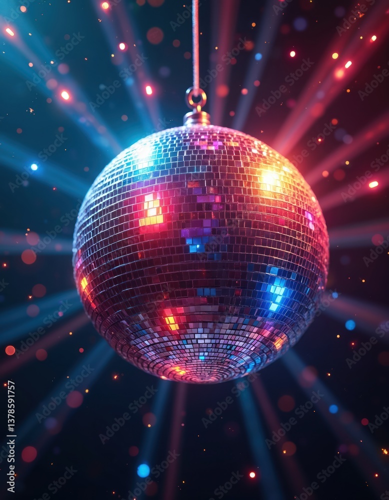• Shiny disco ball with colorful lights. Party, nightlife, dance, music celebration theme background. Mirror ball sparkles, creating vibrant festive atmosphere for clubbing and retro parties.