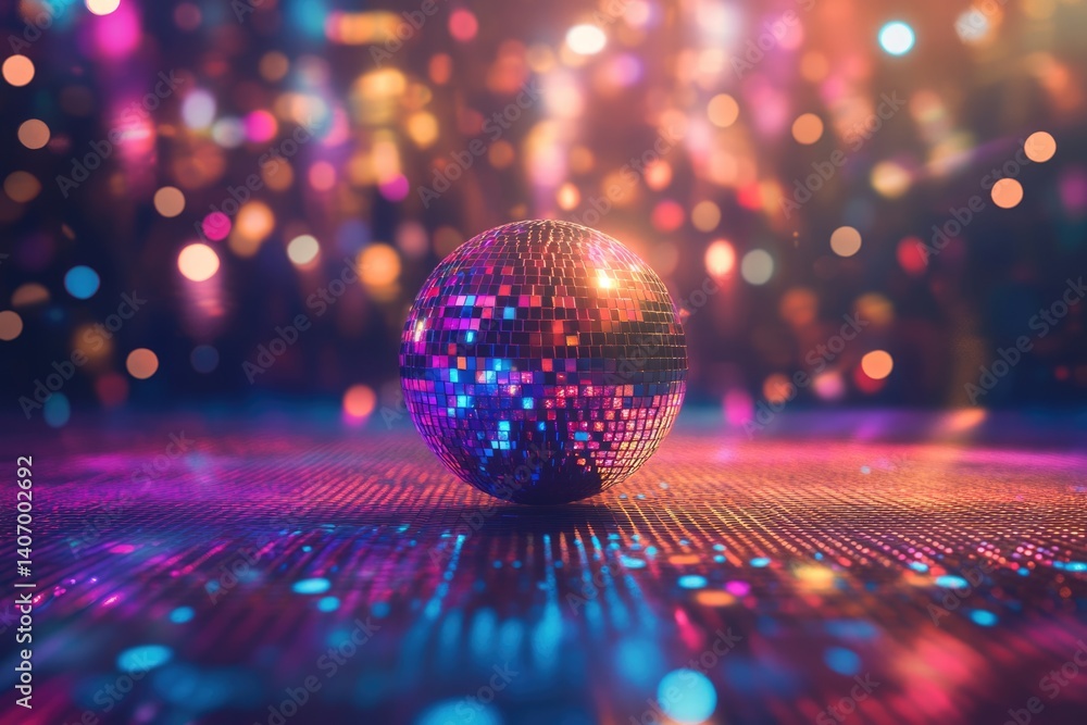 • Disco ball on a shimmering dance floor under vibrant colorful lights, reflecting a festive party atmosphere.
