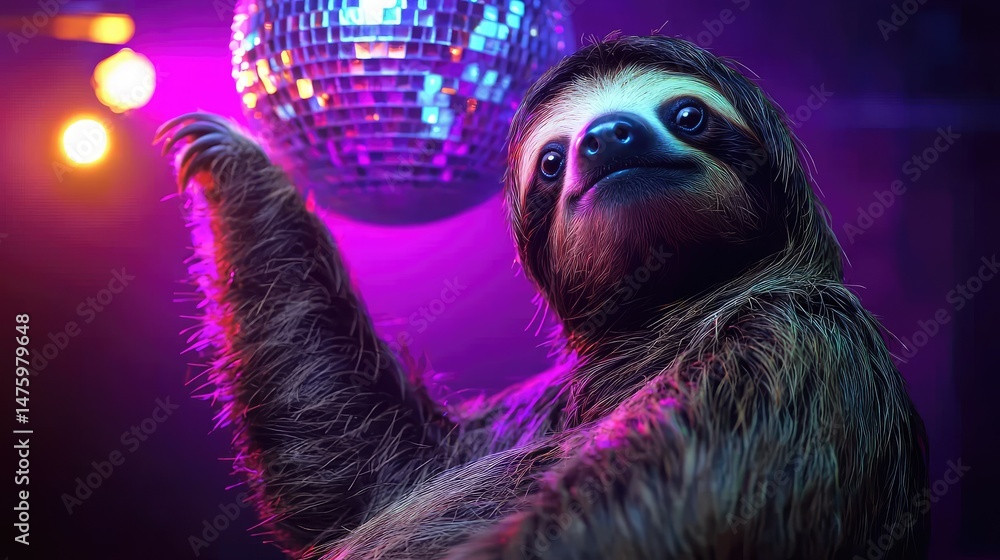 Plakat do Szkoły Tańca - A sloth slowly swaying to music, performing a relaxed dance under the glow of a disco ball. #1475979648