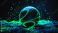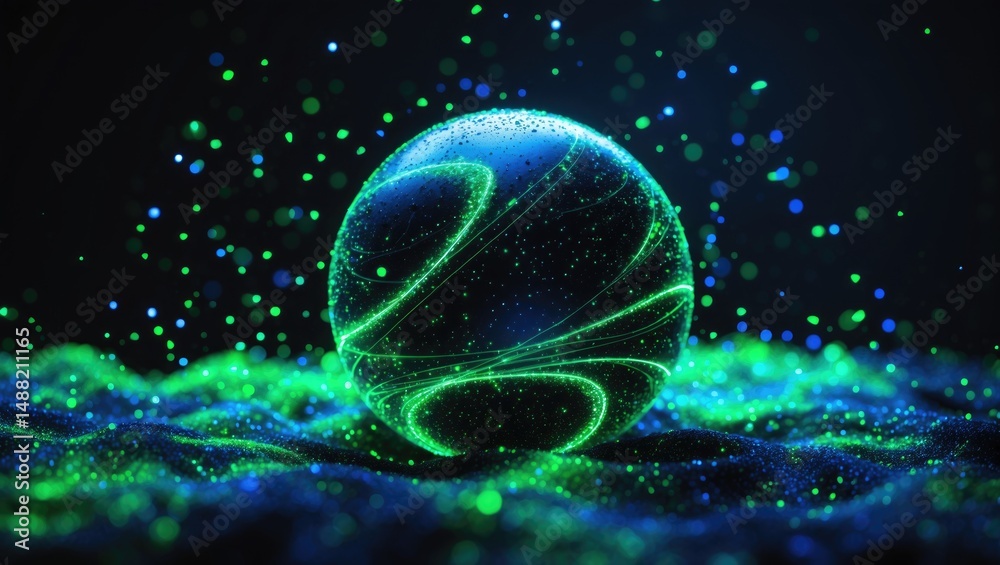 • Futuristic space particles in green and blue on a neon black background with a space sphere VFX design