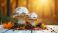 • Silver disco ball style mushrooms stand on a white wooden table top decorated with moss covered cones of autumn leaves, on an autumnal background with bokeh