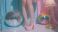 • Aesthetic scene with a woman's legs in pink heels, surrounded by disco balls and a vintage lamp, set against pastel curtains.