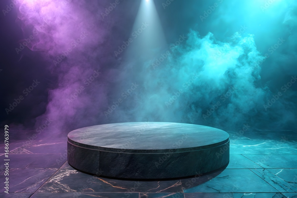 Plakat do Szkoły Tańca - Empty stage podium with dramatic purple and teal colored smoke and spotlights #1686763979