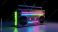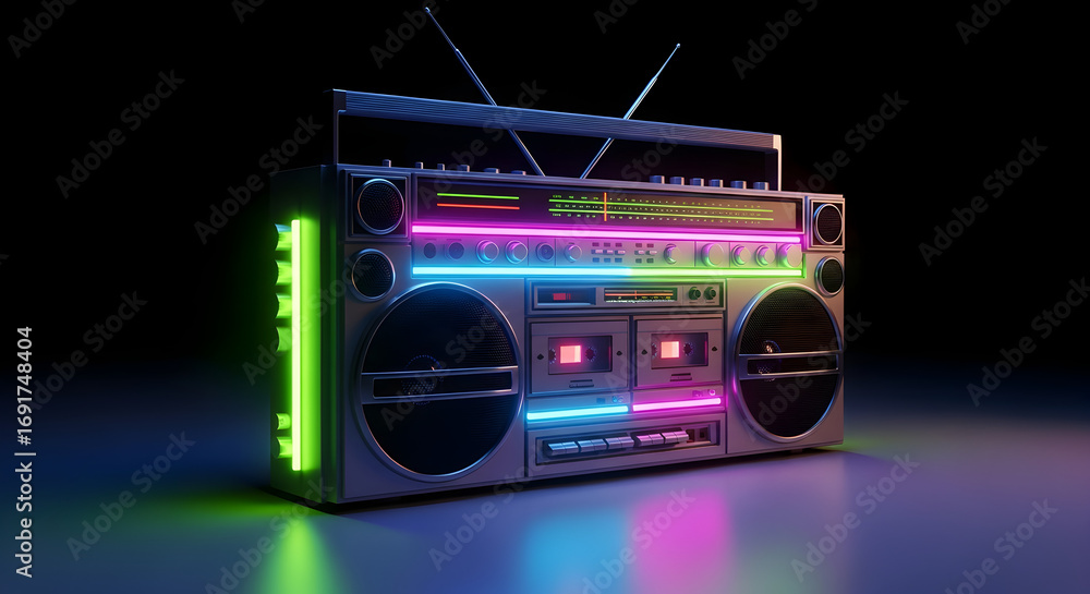 • Retro Boombox Glowing with Vibrant Neon Lights Against a Dark Abstract Background, 80s Style