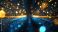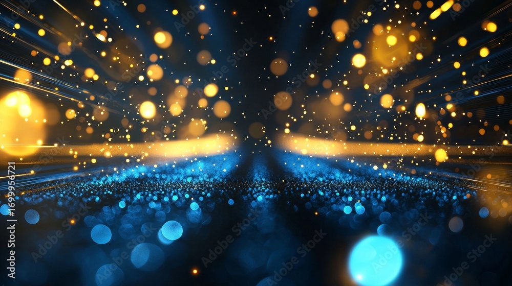 • Dark corridor with blue light neon and gold rays effects with bokeh decorations on black background.
