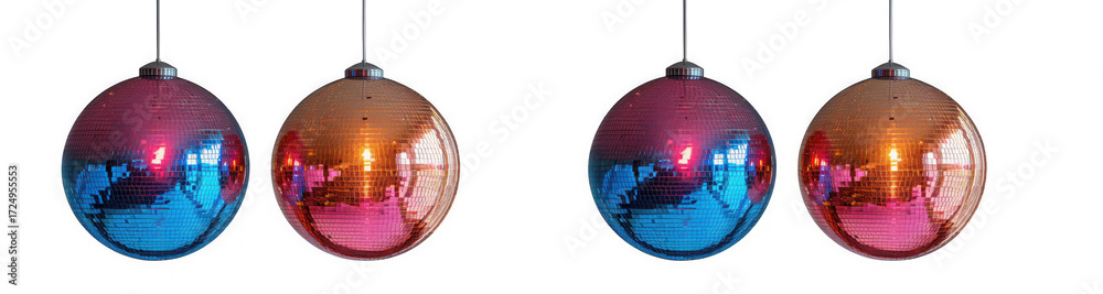 • Four colorful disco balls hanging from above, creating a festive and vibrant atmosphere, isolated on transparent background perfect for party decorations