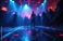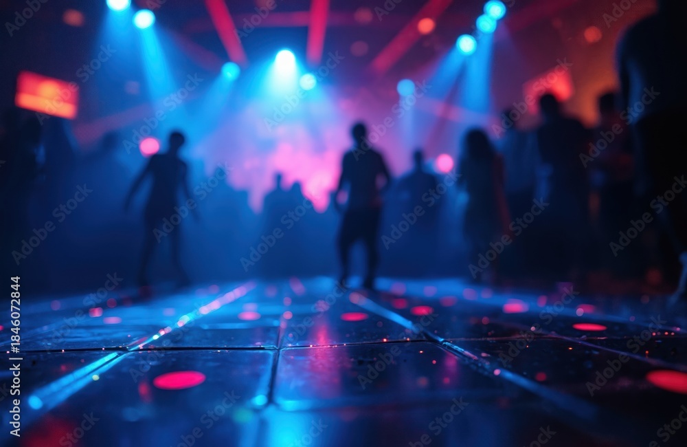 • Blurry disco club dance floor with people silhouettes dancing. Neon blue and pink laser lights flash in smoky dark nightclub creating vibrant nightlife atmosphere for partygoers.