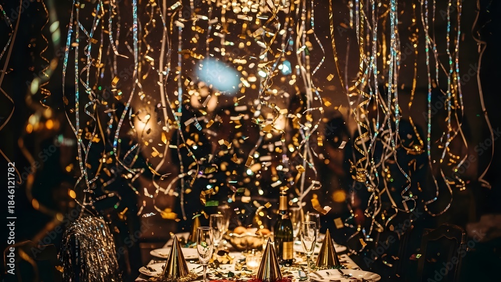 • A vibrant and luxurious party scene, focusing on a table set with party hats, champagne glasses, and a shower of falling gold confetti and streamers. Perfect for New Year's, birthdays, or special even