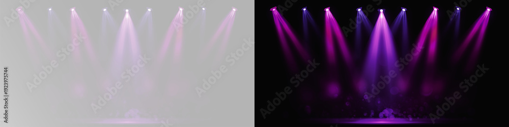 • Pink spotlight stage background. Disco party projector light concert or show scene. Magic beam glow for nightclub or award winner with confetti glitter overlay spotlight purple light for the theater