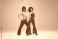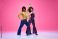 • Groovy dance couple in bright attire performing disco moves in motion against gradient pink studio background. Concept of American culture, 1970s, 1980s fashion, music, comparisons of eras.