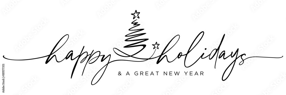 • Modern Minimalist Happy Holidays continuous line handwritten calligraphy, black with Christmas tree for Christmas Holiday New year, card, E-mail signature, printable, isolated on white background