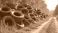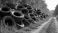 • Large pile of discarded vehicle tires rests in rural setting. Used black rubber waste pollutes natural environment next to dirt road. Illegal dumping represents serious eco problem, global
