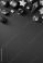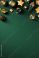 • Luxury Christmas vertical background with gold and green ornaments, baubles, stars, pine cones on dark green table. Art deco style poster design.