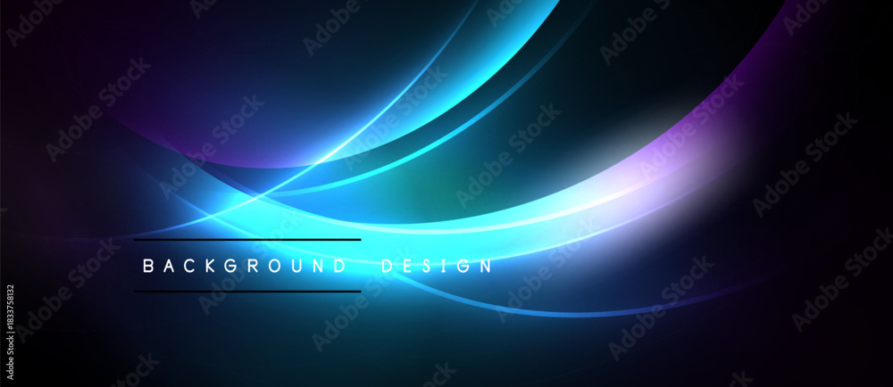 • Abstract dark background features flowing blue, purple light curves. Text reads background design below central glow. Minimalist, modern aesthetic.