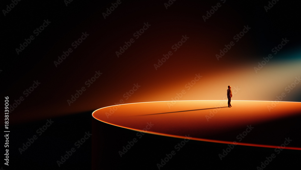 • Modern composition. Man on circular glowing stage in warm minimal scene. Concept of leadership, future digital design, finance strategy metaphors, AI creativity, immersive editorial storytelling.