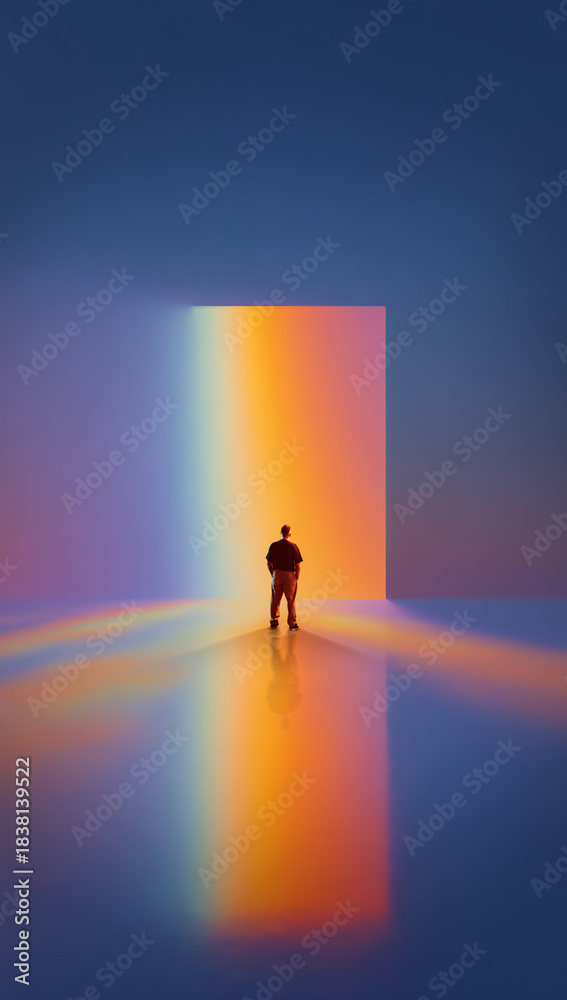 Plakat do Łazienki - Vivid artwork. Man facing glowing rainbow panel in wide minimal hall. Concept of futuristic... #1838139522
