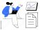 • Woman using laptop, gesturing towards data chart and documents, symbolizing data analysis, business strategy, teamwork, digital marketing, project planning, education and communication. Simple flat
