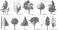 • Collection of ten diverse grey sketched trees with varied foliage and trunk styles on a white background