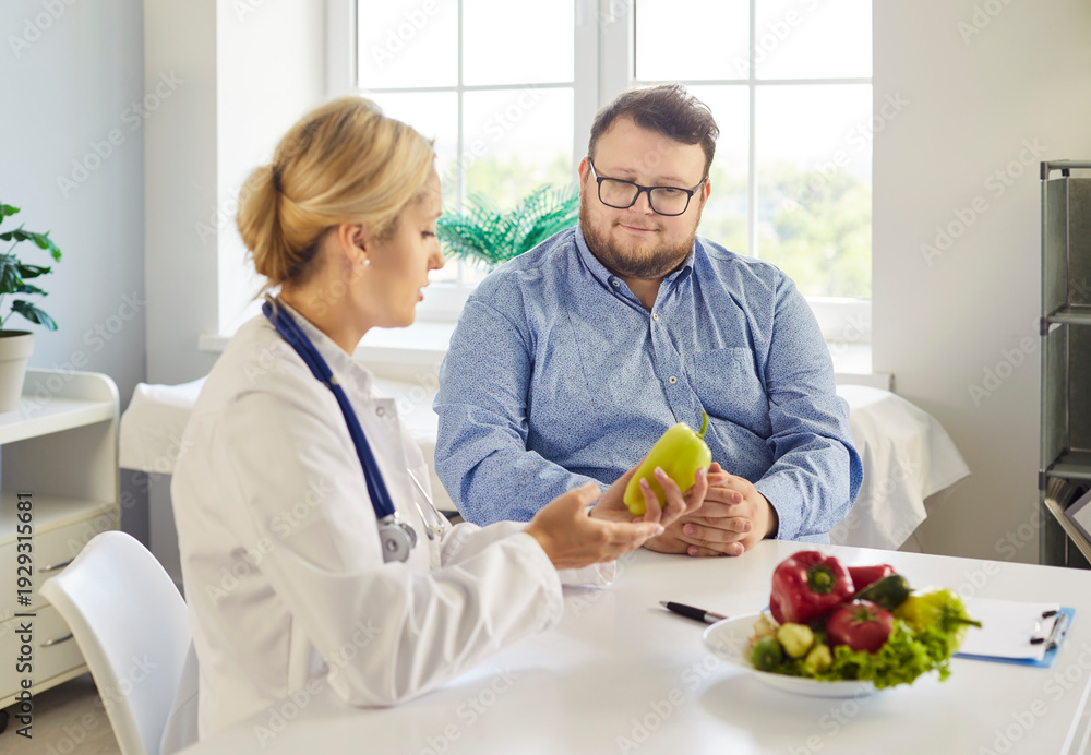 Plakat do Łazienki - Dietitian and patient discuss nutrition and weightloss. Healthcare professional uses vegetables... #1929315681
