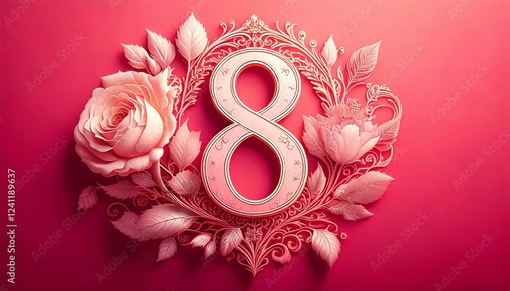 Kwiaty - Różowe tło z różami i datą na dzień kobiet #1241189637