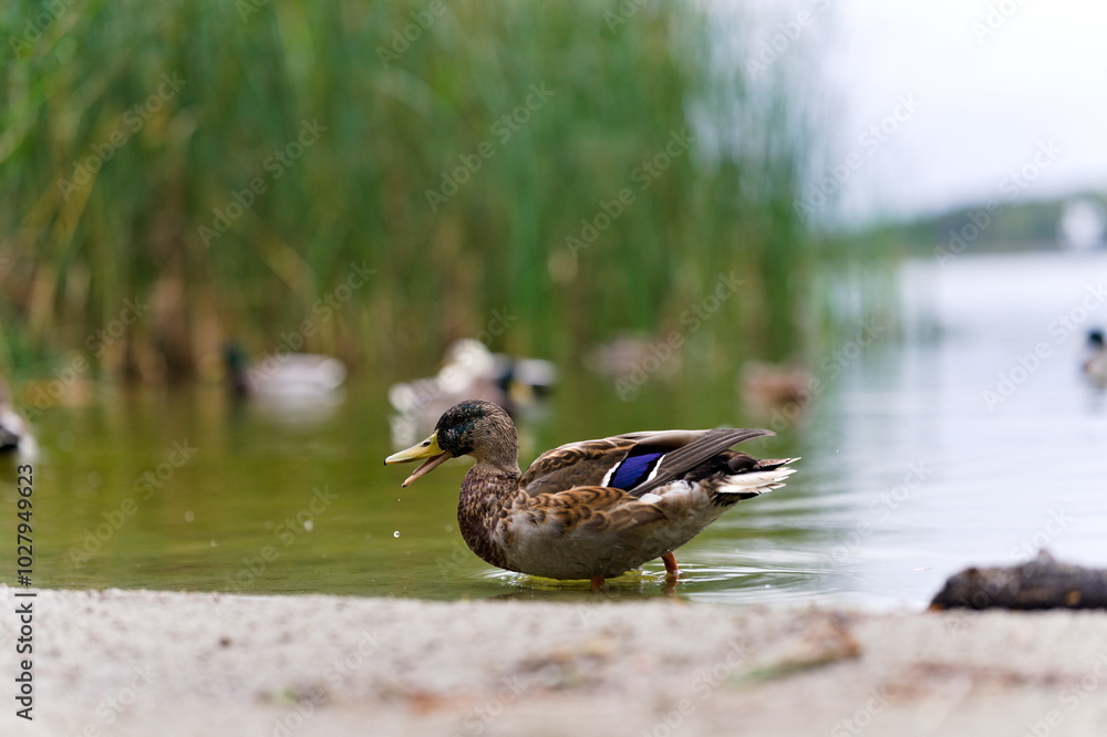 Do Przedszkola - Grupa kaczek krzyżówek przy brzegu stawu #1027949623