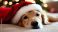 • Uroczy piesek z czapką Świętego Mikołaja stoi w świątecznym otoczeniu.