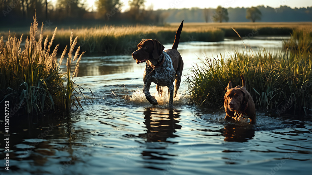 • Dwa psy biegną przez wodę o zachodzie słońca na naturalnym mokradle.