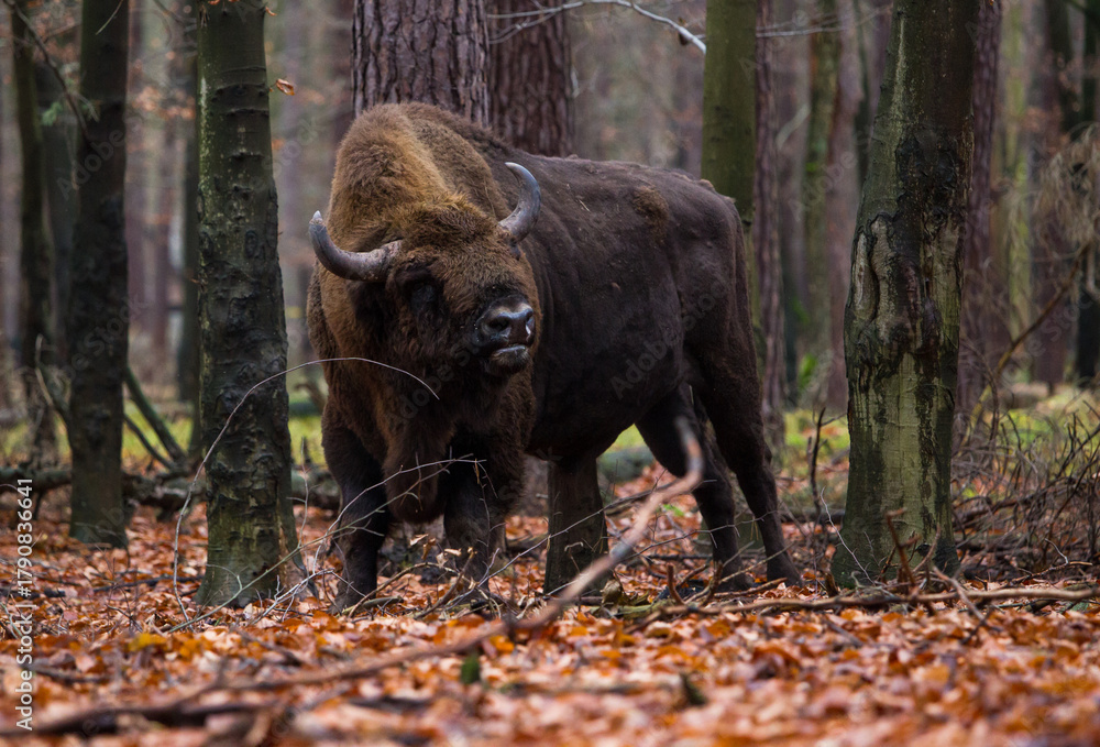 • Stado żubrów w jesiennym lesie Pszczyny Jankowic Polska