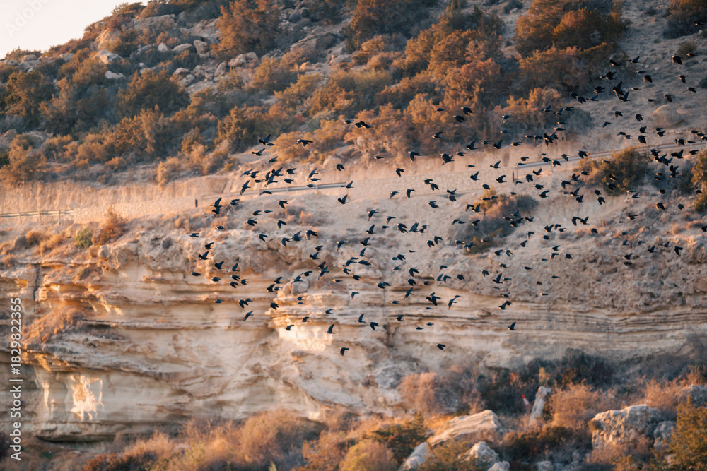 • Stado ptaków nad skalistym wzgórzem o zachodzie słońca